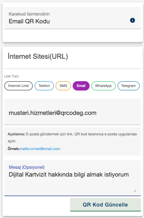 İletişim formu doldurtmakla uğraşmadan, doğrudan e-posta almak ister misiniz? E-posta QR kodu ile kullanıcılar, adresinizi yazmaya ya da kopyalamaya gerek kalmadan, mail uygulamalarını hazır bir taslakla açabilirler. QR kodu; web sitenizde, kataloglarınızda, fuar standınızda, ürün ambalajlarınızda veya kampanya görsellerinizde kullanılabilir. Alıcı adresi, konu satırı ve isterseniz mesaj gövdesi önceden tanımlanabildiği için teklif talebi, randevu isteği, müşteri desteği, kampanya / çekiliş başvurusu gibi tekrar eden e-postaları tek tip ve düzenli şekilde toplamanıza yardımcı olur. Tüm bu alanları ihtiyaç duyduğunuzda kolayca değiştirebilirsiniz.